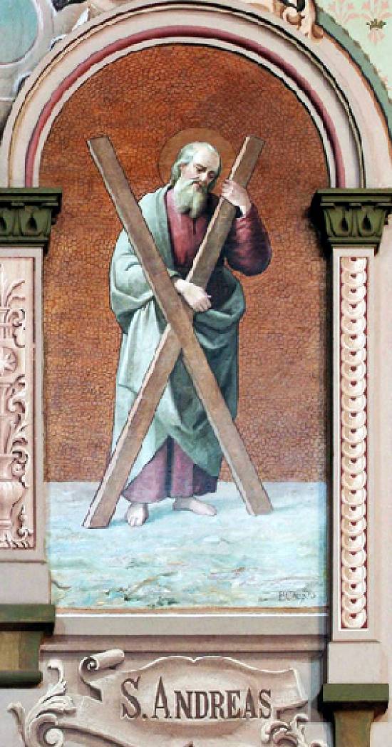Datado de 1925, este óleo sobre tela de 200 x 100 cm, intitulado Santo André, pertence à Igreja Matriz de