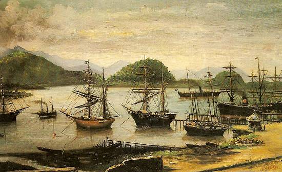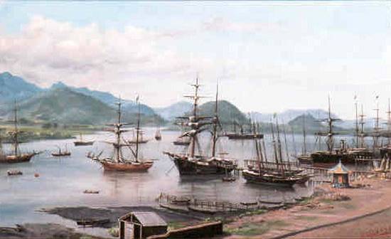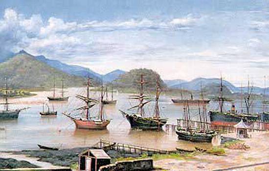seria inaugurada em 1892. Nesta imagem, além dos trapiches para transporte das cargas até os navios a vela, e dos primeiros navios a vapor, vê-se também o abrigo do controle aduaneiro: