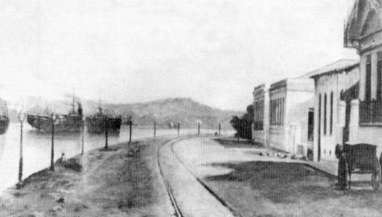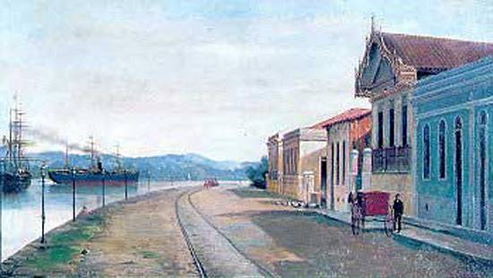 Grã-Bretanha, e que escalou regularmente em Santos até 1885) deixando o porto, defronte à curva do antigo cais do Paquetá.
