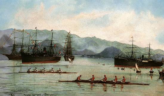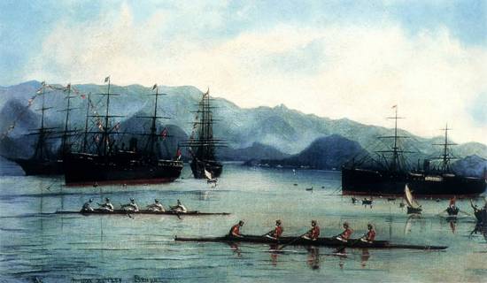 Na época em que a República foi proclamada, tornavam-se populares as competições de remo. Esta ocorreu em Santos em 1889, em meio aos navios a vela (alguns com embandeiramento festivo) fundeados ao largo do porto, na área interna do estuário. O quadro, óleo sobre tela pintado em 1889, com 31,8 x 34,2 cm, pertence a uma coleção particular (o acervo do Clube de Regatas Santista):