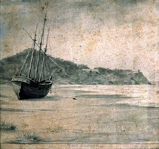 bois pela linha d'água, tendo ainda nas proximidades um barco a vela, possivelmente usado para o transporte de pessoas e mercadorias entre as vilas