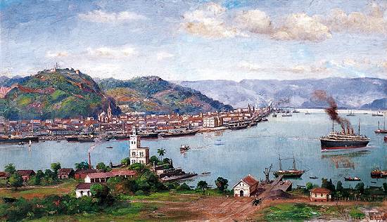 Outra reprodução fotográfica do quadro, denominado Porto e Cidade de Santos Vistos do Itapema: