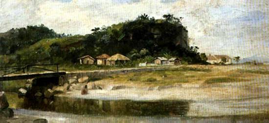 Situado na área insular de Santos, o Morro de Santa Terezinha é visto neste óleo sobre tela não datado, de 14 x 32 cm, pertencente a coleção particular, e que tem como título o nome do local