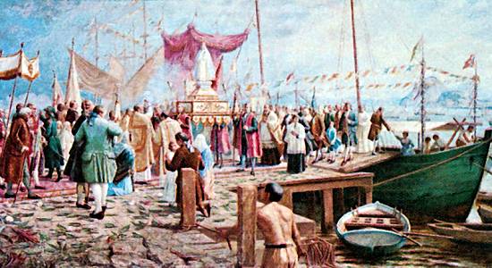 em procissão até Vitória. No meio do caminho, o céu escureceu e choveu abundantemente. Essa história motivou Calixto a pintar em 1926 este óleo sobre