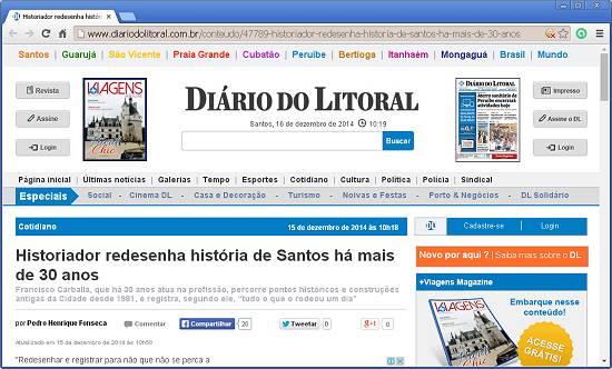 Matéria publicada nas versões impressa (página 4) e eletrônica do jornal santista Diário do Litoral, em 15 de dezembro de 2014: