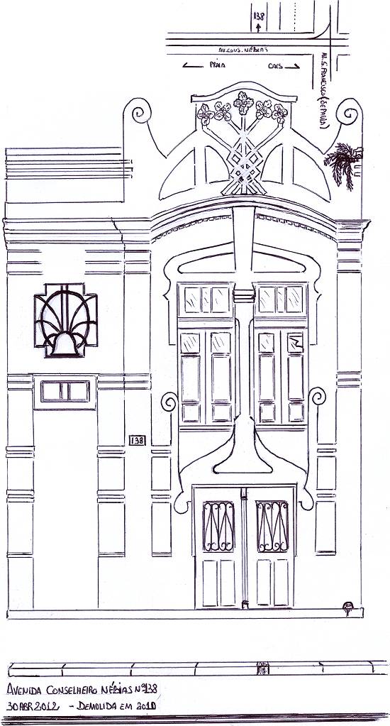 Avenida Conselheiro Nébias, 138, em desenho iniciado antes da demolição em 2010 e completado em abril de 2012."Feita em art nouveaux, seus moradores mantinham uma imagem de São Jorge dentro do curioso gradil que recordava um sino. O estranho ramalhete do frontão antes era colorido; depois que se mudaram os antigos proprietários, tornou-se um cortiço, mas o santo permaneceu ali", como informa o autor do desenho. Em 2012, funciona no terreno um estacionamento para automóveis