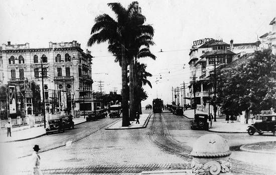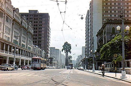 Pouco antes da extinção do serviço de bondes em Santos (em 1971), esta foto mostra dois desses coletivos circulando pela avenida, tendo à direita ainda o antigo hotel