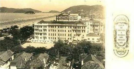 Um raro cartão postal mostra o Atlântico Hotel e a "Praia de Santos, a mais linda das praias sul-americanas", tendo em primeiro plano o jardim do hotel Parque Balneário, em 1942: