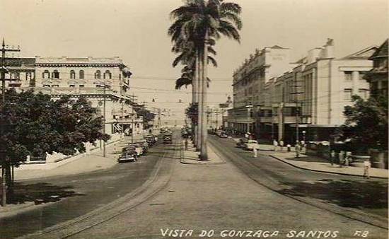 Nesta vista aérea, a praia do Gonzaga e seus hotéis em primeiro plano, e acompanhando a Avenida Ana Costa, a Praça da Independência com seu monumento. Note-se que o hotel Parque