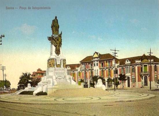 A Praça da Independência perdeu aos poucos os antigos casarões que a cercavam, como os observados nesta imagem de meados da década de 1920, que  mostra alguns deles ao fundo, tendo ao centro o monumento aos Andradas: