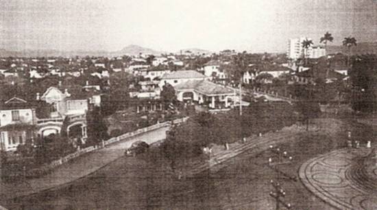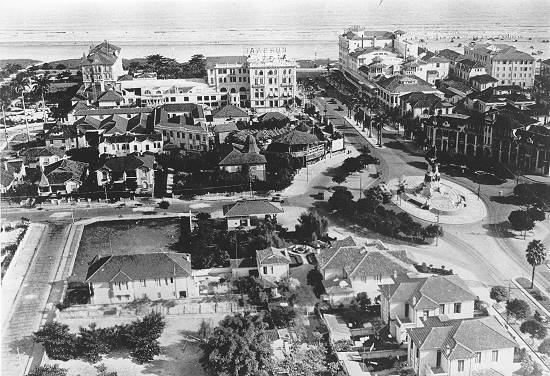 Tendo em primeiro plano o palacete de Áurea Conde e o antigo casario no entorno da praça, esta aparece em vista aérea possivelmente de meados da década de 1930: