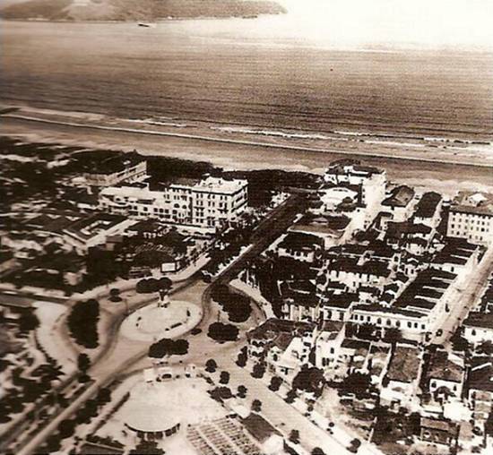 A arborizada Avenida Ana Costa no trecho final, da praça até a praia do Gonzaga, em vista aérea possivelmente de fins da década de 1940: