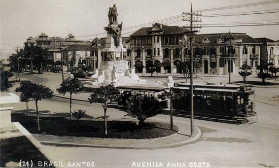 Abaixo, em meados da década de 1920, o trecho final da Av. Ana Costa, visto desde a Praça da Independência, com o bonde 2 e seu reboque. Note-se à direita, junto à praia, as instalações antigas do hotel Atlântico: