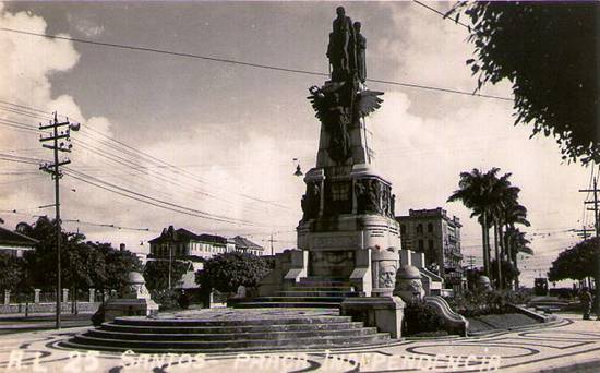 Outra vista da praça, em ângulo aproximado e na mesma época, com o monumento aos Andradas e ao fundo ainda o Parque Balneário Hotel: