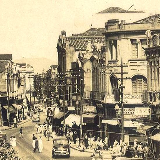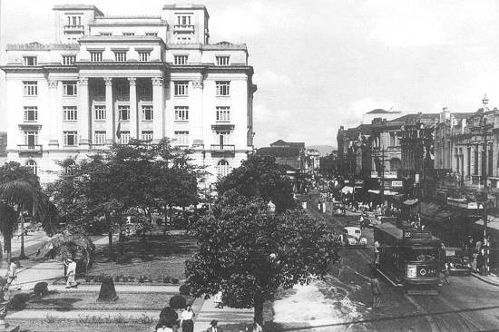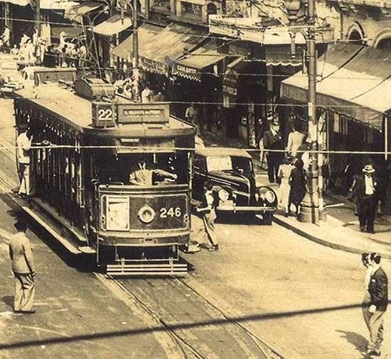 Em 1947, em meio ao corre-corre de uma cidade em intenso movimento, o bonde da linha 22 circundava a praça, pelo lado da Rua General Câmara, a caminho de São Vicente, onde faria ponto