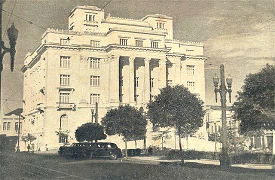 Em 1941, vê-se neste postal a frente do novo prédio da Prefeitura (inaugurado em 26/1/1939), tendo aos fundos (já na Rua Augusto Severo) as instalações do Colégio do Carmo (à