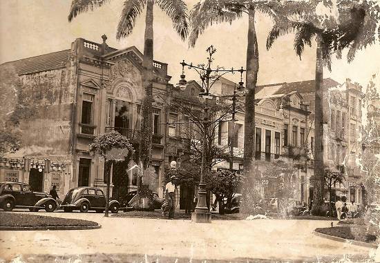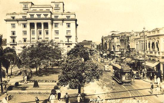 A praça Praça Visconde de Mauá em 1934, na esquina com a Rua Dom Pedro II. À direita, o prédio da antiga Santa Casa de Santos, agora não mais