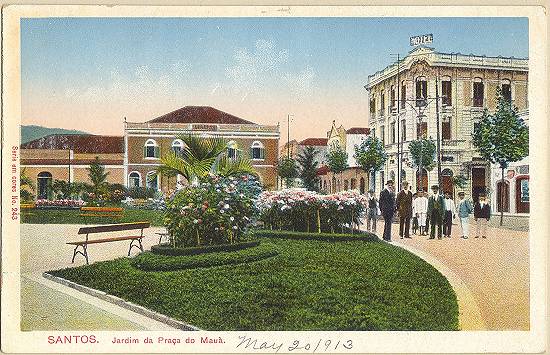 Os jardins ocupavam a Praça Mauá na década de 1910, como mostra este cartão-postal colorizado, bem anterior à inauguração do atual prédio da Prefeitura, que ocorreu em 1939. À
