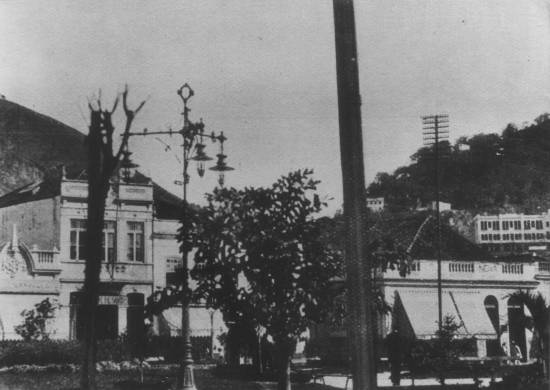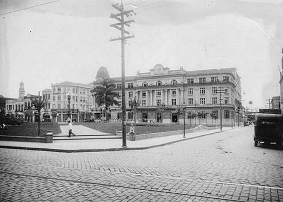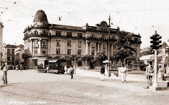 Este cartão postal da década de 1930 mostra em destaque o prédio do Correio e a praça que em 1939 seria ocupada pelo Palácio José Bonifácio, o Paço Municipal. Note-se ainda a presença do bonde