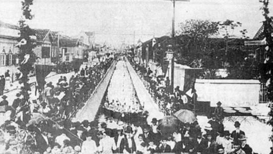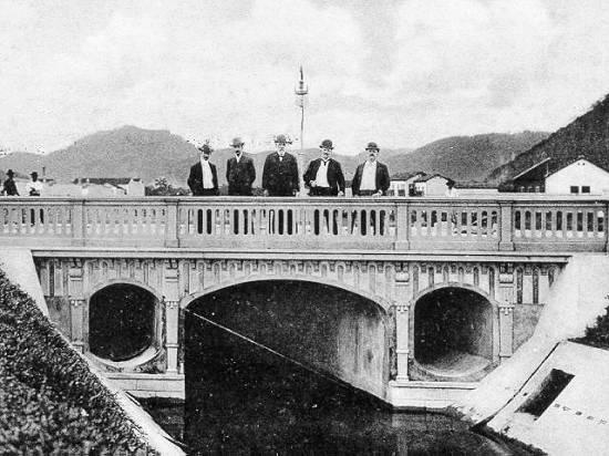 Ponte na Rua Braz Cubas sobre o canal da Avenida Rangel Pestana, feita em concreto armado, quando da inauguração em 27 de agosto de 1907 do trecho inicial do canal. O povo fazia fila para