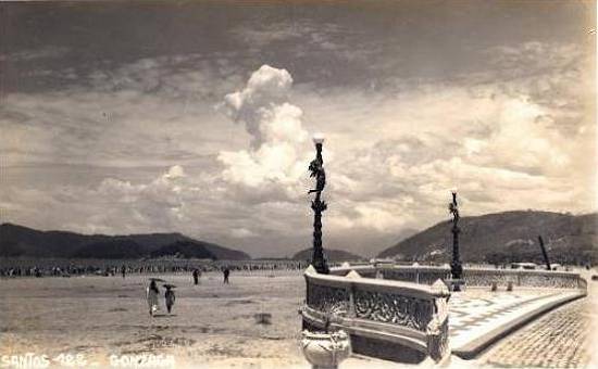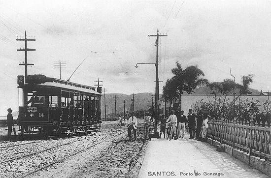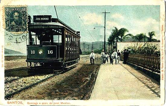 Poucos anos depois, o Gonzaga começou a ser atendido por bondes que faziam ponto na praia, perto da Avenida Ana Costa. Esta imagem é de um cartão postal da época, tendo ao fundo a praia do José