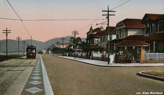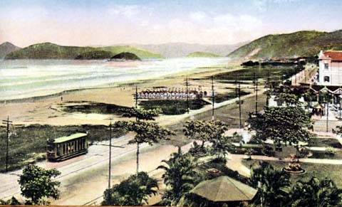 O Gonzaga, em 1920, com bondes circulando pela praia: