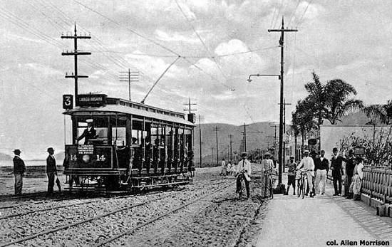 O bonde prefixo 212, da linha 3, em 1930, circulando pela praia: