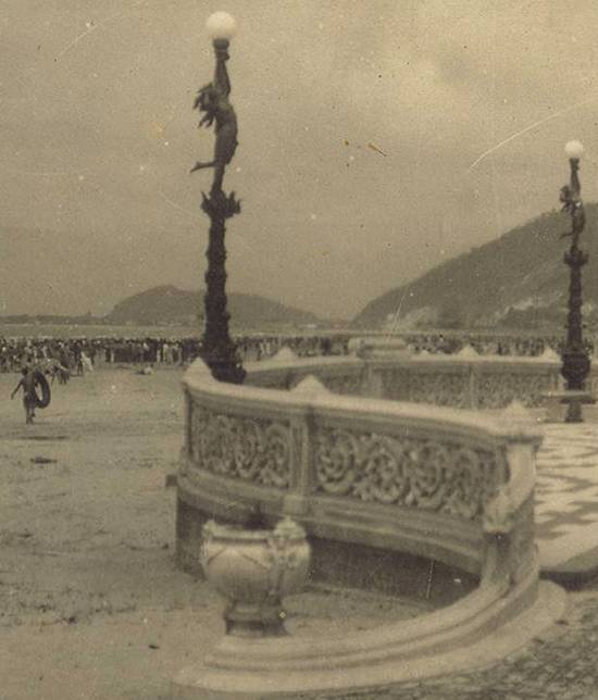 Centro, e que foram transferidos para esse local. Apenas a parte do globo foi modificada, com a retirada do arco ornamental. O cartão é dos anos de 1940 e destaca na praia uma mãe e sua filha, com roupas e sombrinhas: