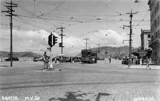 | Em 1908, a Praia do Gonzaga começava a ser ocupada por chácaras dos magnatas da economia cafeeira, que ali chegavam em seus veículos