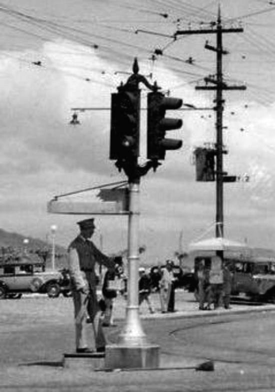 O policial encarregado de manipular o semáforo do trânsito se destaca neste postal do Gonzaga, defronte à Avenida Ana Costa, junto com o bonde