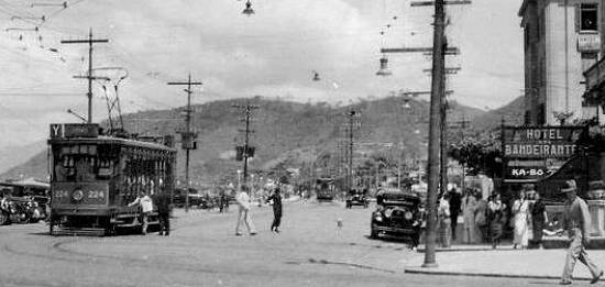 expresso "Y" que aguarda liberação para deixar a via praiana, em frente ao prédio do hotel Avenida Palace, por volta de 1940: