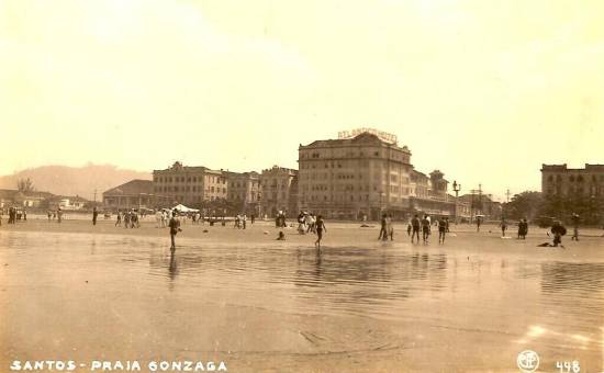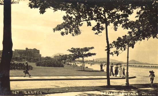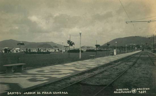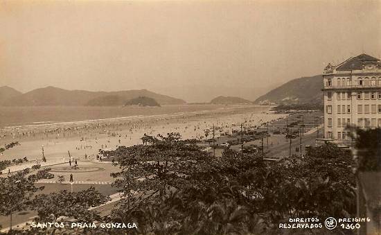 Na década de 1930, a Praia do Gonzaga já era um grande atrativo turístico santista, figurando em inúmeros cartões postais. Neste, raro, vê-se no jardim um antigo relógio público, não mais existente, e ao fundo, além dos prédios do Clube XV (atrás do relógio) e dos hotéis Avenida, Belvedere e Bandeirantes, vê-se um antigo bonde-sanfona, circulando pela avenida praiana: