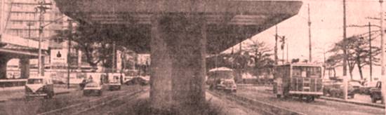 Trecho inicial da Avenida Presidente Wilson, na orla da praia do Gonzaga, com destaque para o hotel Atlântico, na esquina da Avenida Ana Costa. À direita, o abrigo para os passageiros de bondes, no estilo modernista que caracterizou as construções de meados da década de 1950, e enfeites luminosos natalinos pendurados na fiação: