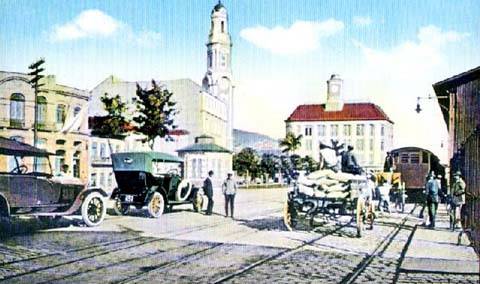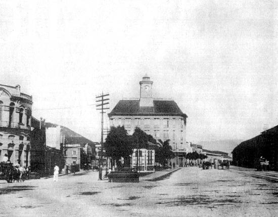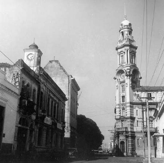 Neste cartão postal de 1927 (mas com foto de 1925, também reproduzida em outro postal, colorizada manualmente), o relógio da Western é visto ao centro, tendo à esquerda