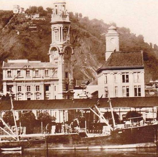 Por trás dos prédios, o Monte Serrat, com as marcas da instalação do funicular e ainda sem o prédio do cassino (ambos seriam