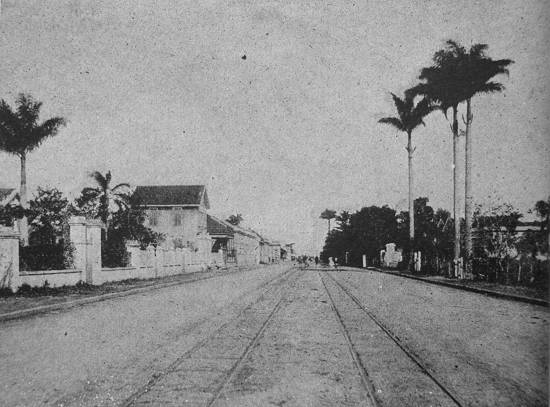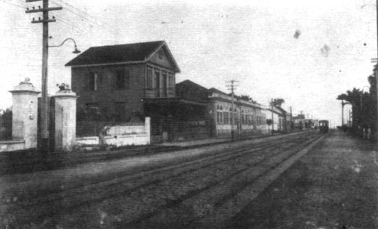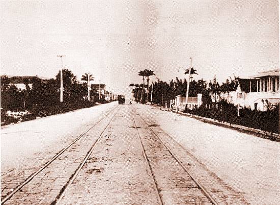 Esta foto, de 1904, mostra o mesmo trecho, com o bonde circulando pela linha de retorno ao Centro: