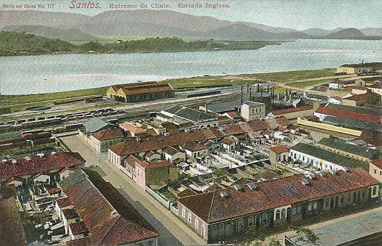 Este cartão postal do jornalista José Carlos Silvares mostra a ferrovia SPR e a usina de gás. Ele comenta: "A estrada ingleza - Início dos anos de 1900 - Este belo cartão postal editado com o título Extremo da Cidade - Estrada Ingleza, mostra ao fundo parte dos trilhos da São Paulo Railway, então operada por companhia inglesa, avançando sobre o Porto de Santos, na região entre os bairros de Alemoa e Valongo, bem como os galpões da ferrovia e pátios de manobra. Note as residências e casas comerciais. Na imagem aparece também a Usina de Gás da The City of Santos Improvements & Company Ltd., que funcionava na Rua Marquês de Herval, no Valongo (ao alto, à direita)":