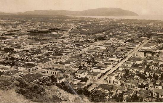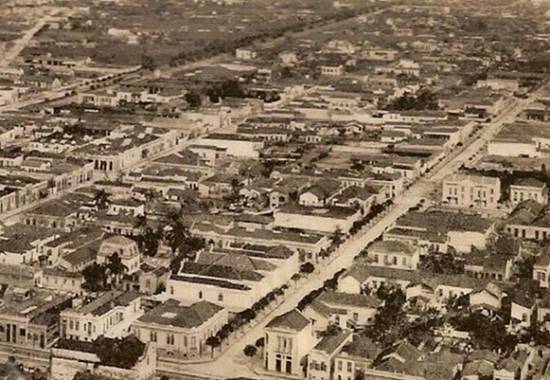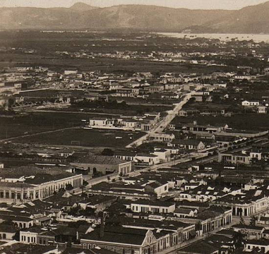 Vila Mathias, tendo em primeiro plano a Rua Rangel Pestana e quase ao centro a Rua Comendador Martins (interrompida pela área pantanosa dominada pelos córregos chamados Dois Rios, no futuro bairro do Gonzaga), à esquerda o novo traçado da Avenida Washington Luiz, ao fundo o terreno do Boqueirão (com o casario ao redor da Av. Conselheiro Nébias)