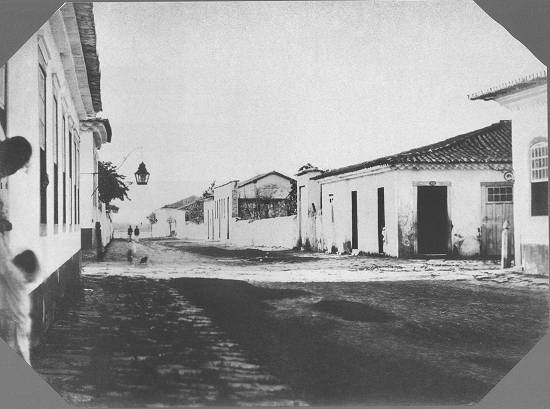 fez esta foto, mostrando o Caminho da Barra (no trecho que é conhecido atualmente como Rua Braz Cubas), aqui visto em direção Sudeste. O casarão (de