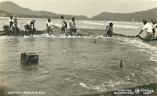 Até a década de 1950, era comum ver pescadores com rede profissionais e amadores atuando em toda a extensão das praias santistas (e também nas de Guarujá), como nesta foto: