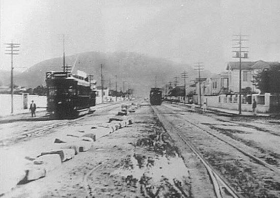 Em 1910, os bondes elétricos já trafegando no trecho inicial da avenida, tendo ao fundo o Monte Serrat: