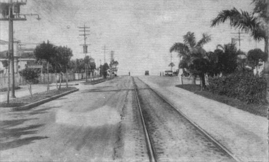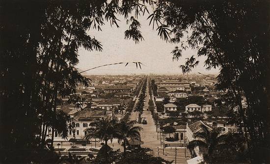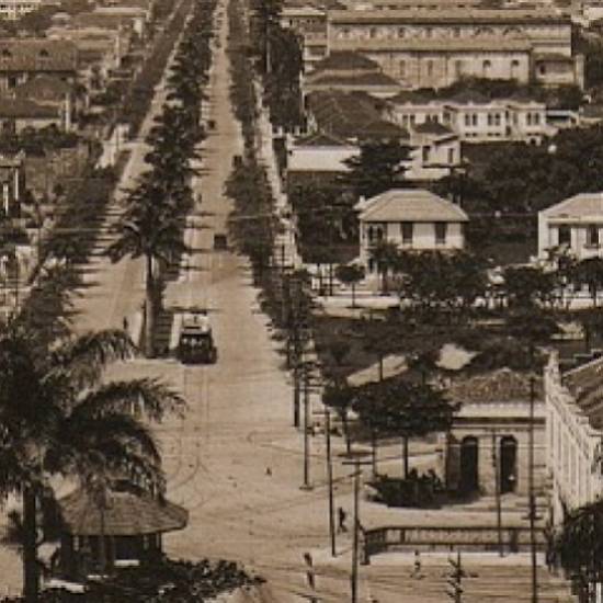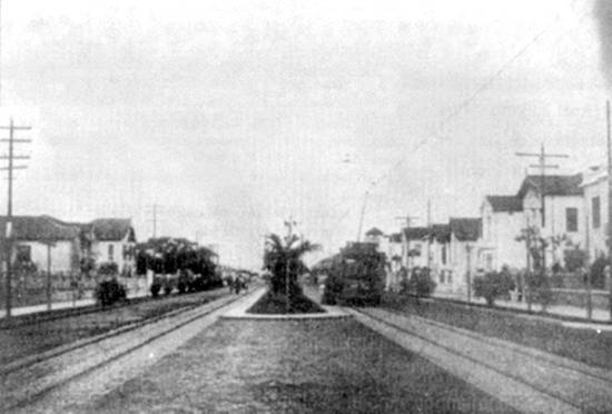 Nesta outra imagem (cerca de 1935), a vegetação no canteiro central da avenida ainda era mais baixa que o bonde elétrico que por ela trafegava então: