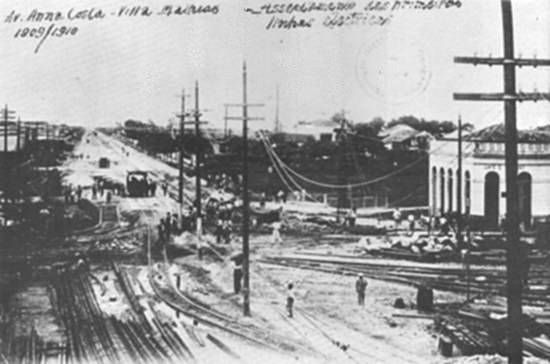 Em 1909/1910, uma vista das obras de implantação do sistema de bondes elétricos na avenida, no trecho inicial (Vila Mathias, confluência com a
