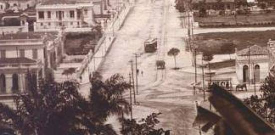 No detalhe da imagem acima, que permite melhor datar a foto, vê-se um bonde elétrico na Avenida Ana Costa, ao centro, junto com um bonde de tração animal na então Rua Rangel Pestana, à direita.