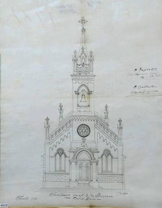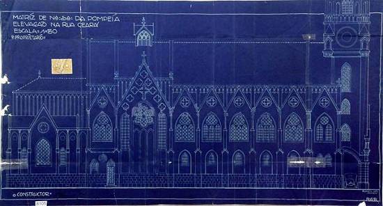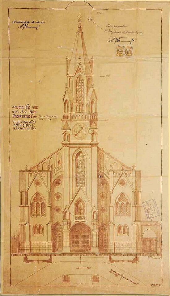 Projeto anterior para reforma da fachada do Santuário de Nossa Senhora da Pompéia, em escala 1:50, com rosácea (depois substituída por relógio) e torre