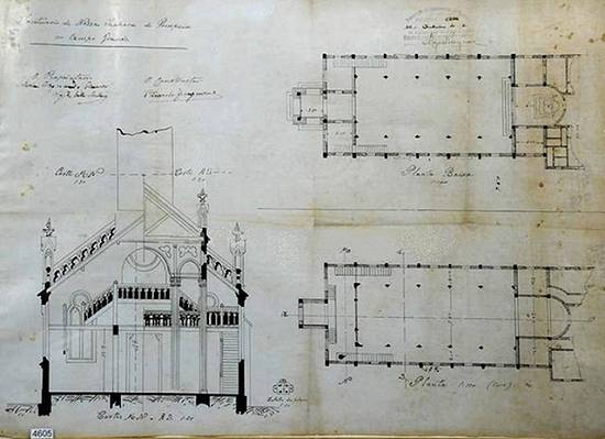 Fachada da igreja, em planta de elevação principal, desenhada em 1931 pelo arquiteto E. Keniz para o padre Genésio Nogueira Lopes (cópia heliográfica em
