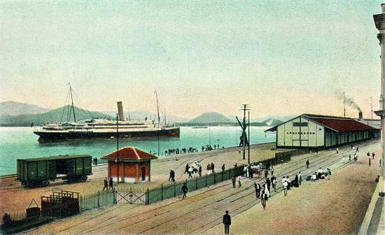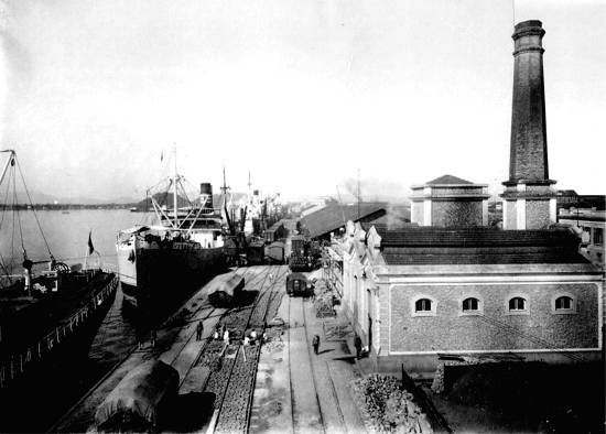 Por volta de 1902/3, o cais do porto santista, vendo-se uma das casas de compressores, as linhas férreas para cargas e as embarcações a vela, ainda comuns. Ao fundo, da esquerda para a direita, o Monte Serrate e o morro do Fontana, tendo em último plano a Serra do Mar: