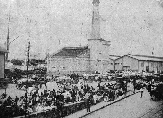 Em cartão postal do Bazar de Paris, do início do século XX, outra imagem do porto, vendo-se ao fundo o Armazém 4 e ao centro as instalações da casa de compressores, com sua chaminé (os compressores é que permitiam acionar os guindastes hidráulicos do cais):