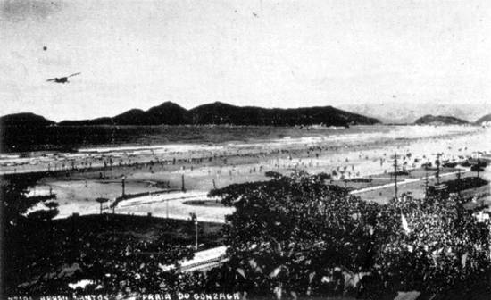 A praia do Gonzaga, em postal de fins da década de 1940 (note-se a existência de apenas uma pista na avenida litorânea, ao lado dos trilhos dos bondes). Esse postal, em princípios de 2008, era negociado no site de leilões EBay/Itália:
