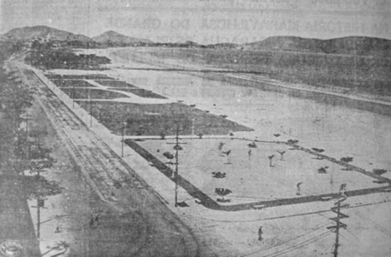 "AS NOSSAS PRAIAS E O SEU EMBELEZAMENTO - Interessante aspecto fotográfico das importantes obras de embelezamento das nossas praias, que a Prefeitura Municipal presentemente está ultimando. O clichê que ilustra estas linhas reproduz a parte já concluída, no início da Avenida Vicente de Carvalho, no Gonzaga. Os serviços de aformoseamento das nossas praias estão sendo executados de acordo com o projeto organizado pela Diretoria de Obras da Prefeitura, equivalendo por mais um ótimo serviço prestado às praias santistas pelo dr. Aristides Bastos Machado, chefe do Executivo local. Compreendem essas obras de vulto o ajardinamento das praias em toda a sua extensão, além de um passeio de cinco metros de largura, próximo às linhas de bondes, e de uma avenida asfaltada, destinada ao tráfego de automóveis, nos moldes da Avenida Presidente Wilson."